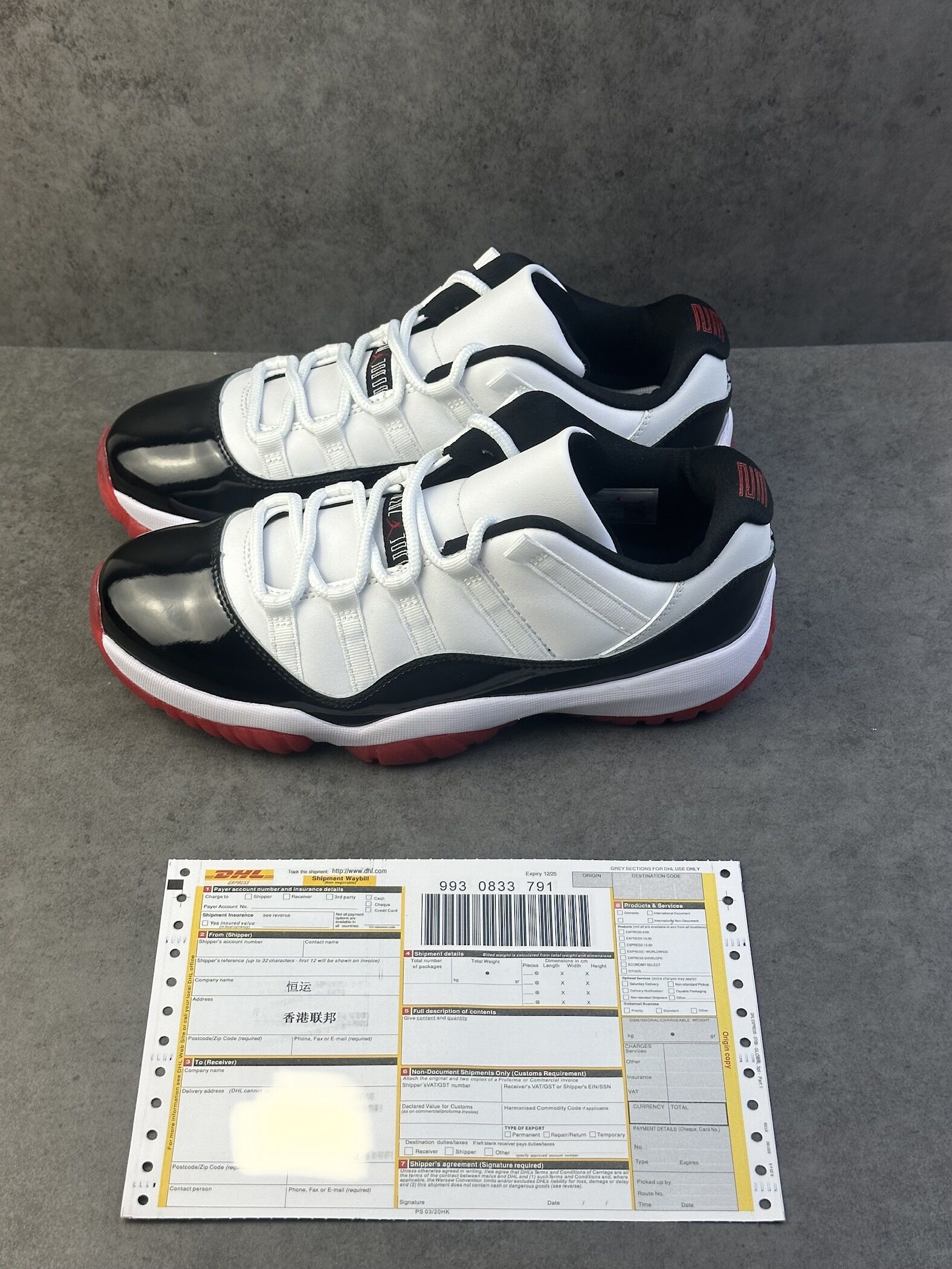 The Jordan 11 Low Concord Bred consists of a white upper with black patent leather overlays and black detailing. A white midsole, red translucent outsole, and Jordan branding on the tongue complete the design. These Jordan 11 Lows released in June of 2020 and retailed for $185 USD.