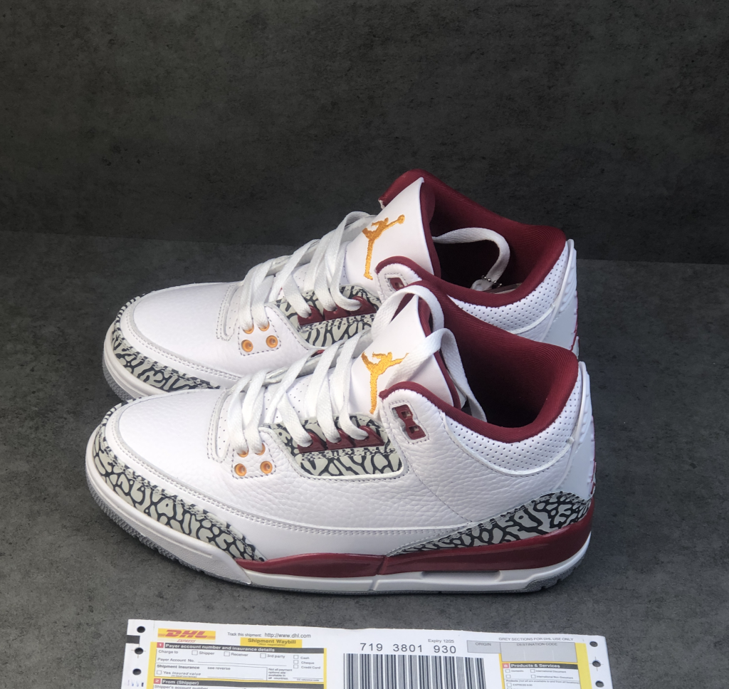 Constructed with white tumbled leather and signature Elephant Print overlays, the Air Jordan 3 Cardinal Red takes a traditional approach in its color blocking and fabrication, similar to the iconic Black Cement 3s. Spicing up the design, sharp Cardinal Red midsoles and detailing pop against the neutral toned upper. Bright orange Jumpman logo embroidery on the tongue adds the finishing touch.