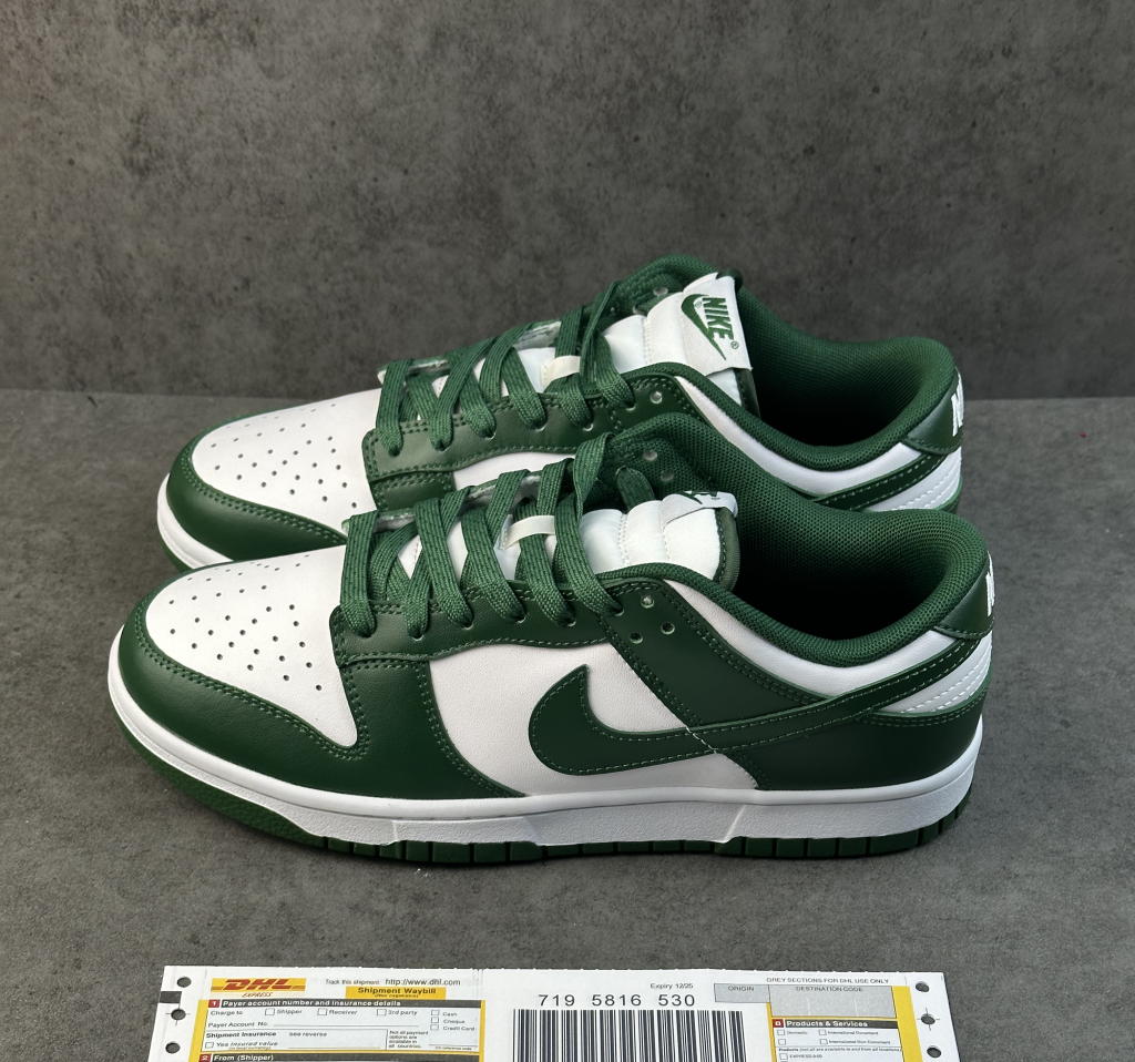 The Nike Dunk Low Varsity Green is composed of white leather uppers with Varsity Green leather overlays and Swoosh logos. From there, woven retro Nike logo tongue labels and heel embroidery nod to original Dunks from 1985.