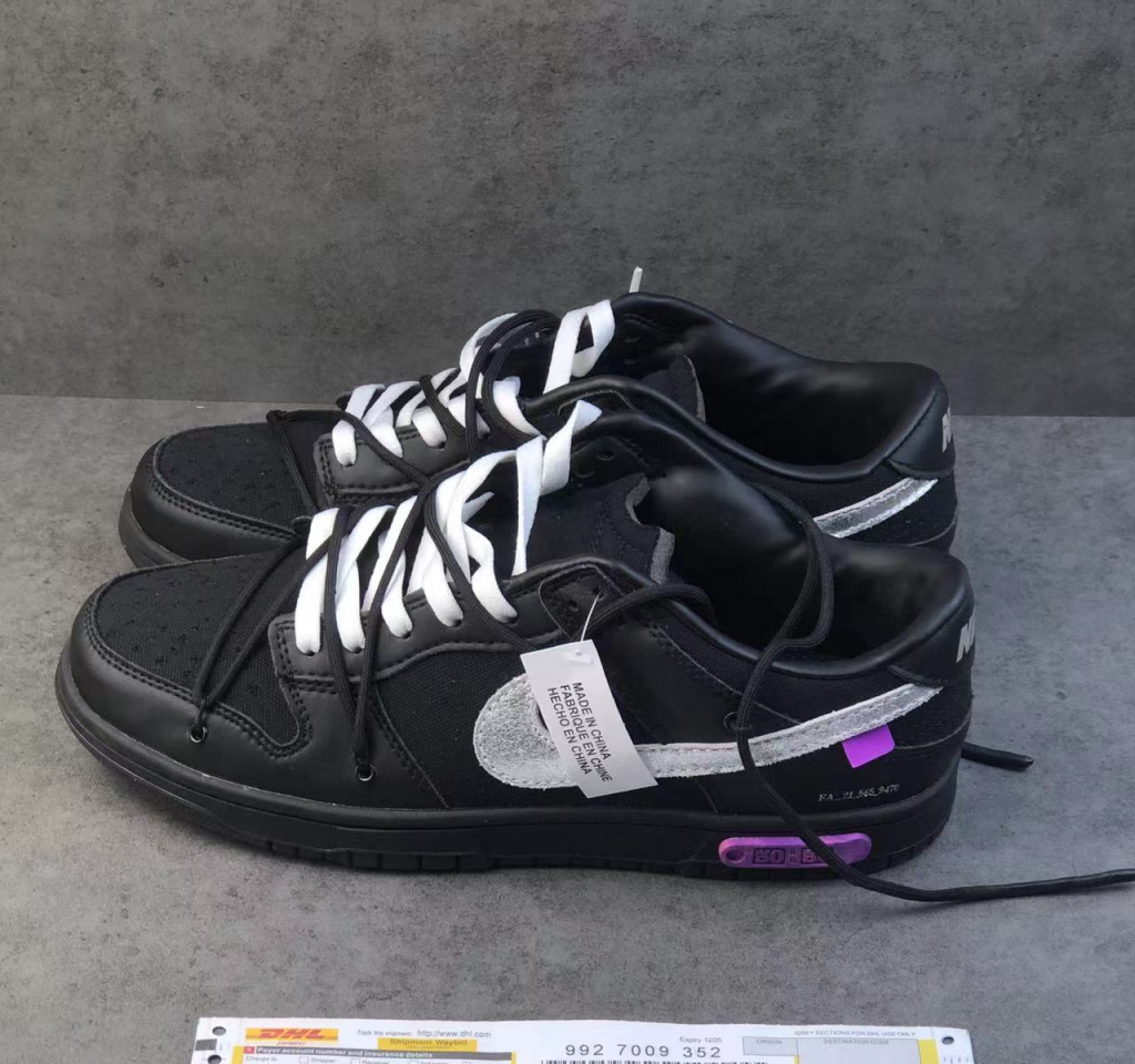 The Nike Dunk Low Off-White Lot 50 features a black canvas upper with smooth black leather overlays and silver Swooshes. From there, black soles with purple “Lot 50 of 50” placquets, black overlays, and purple detailing complete the design.